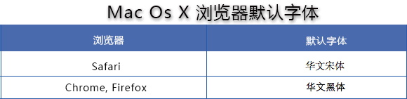 Mac下的Safari默认使用华文宋体,Chrome默认使用华文黑体。如下图所示:
