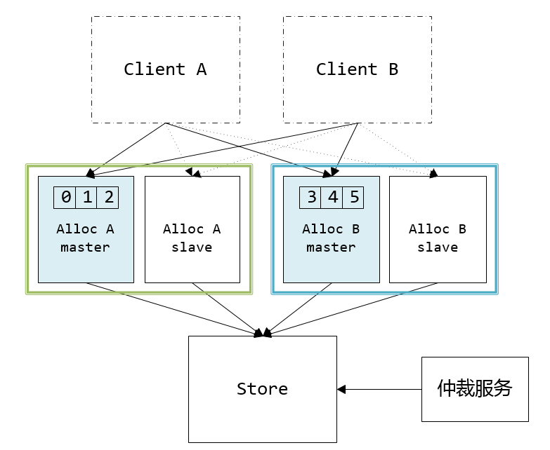但也由于这个约束,多台AllocSvr同时服务同一个号段的多主机模型在这里就不适用了。我们只能采用单点服务的模式,当某台AllocSvr发生服务不可用时,将该机服务的uid段切换到其它机器来实现容灾。这里需要引入一个仲裁服务,探测AllocSvr的服务状态,决定每个uid段由哪台AllocSvr加载。出于可靠性的考虑,仲裁模块并不直接操作AllocSvr,而是将加载配置写到StoreSvr持久化,然后AllocSvr定期访问StoreSvr读取最新的加载配置,决定自己的加载状态。