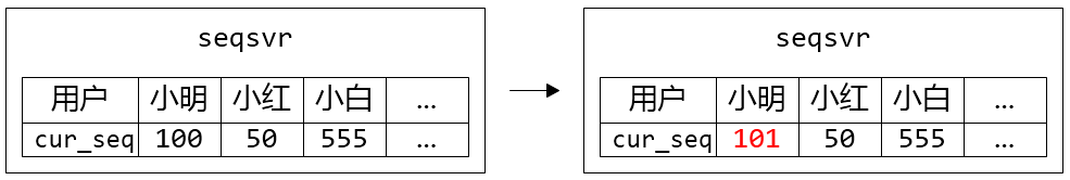图2. 小明、小红、小白都各自申请了一个sequence,但只有小白的max_seq增加了步长100
