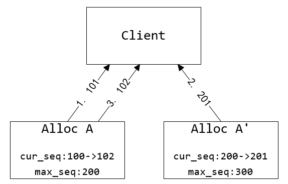 图5. 两台AllocSvr服务同个uid造成sequence回退。Client读取到的sequence序列为101、201、102