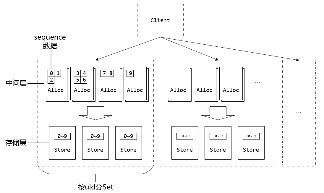 整个系统又按uid范围进行分Set,每个Set都是一个完整的、独立的StoreSvr+AllocSvr子系统。分Set设计目的是为了做灾难隔离,一个Set出现故障只会影响该Set内的用户,而不会影响到其它用户。