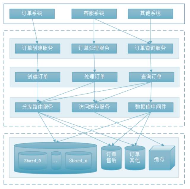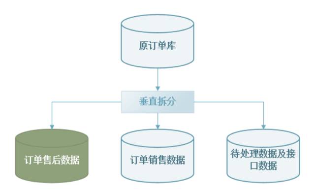 原订单库把所有订单相关的数据(订单销售、订单售后、订单任务处理等数据)都放在同一数据库中,不符合电商系统分层设计,对于订单销售数据,性能第一,需要能够在大促高峰承受每分钟几万到几十万订单的压力;而售后数据,是在订单生成以后,用于订单物流、订单客服等,性能压力不明显,只要保证数据的及时性即可;所以根据这种情况,把原订单库进行垂直拆分,拆分成订单售后数据、订单销售数据、其他数据等,如下图:
