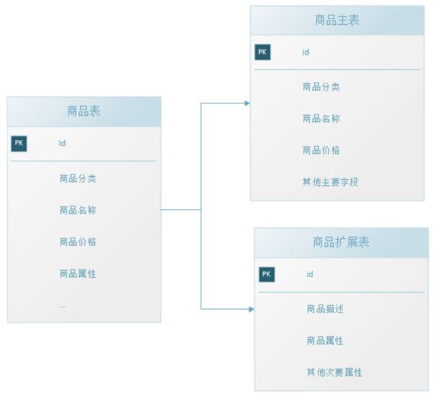 垂直拆表是对数据表进行垂直拆分的一种方式,常见的是把一个多字段的大表按常用字段和非常用字段进行拆分,每个表里面的数据记录数一般情况下是相同的,只是字段不一样,使用主键关联,如下图:
