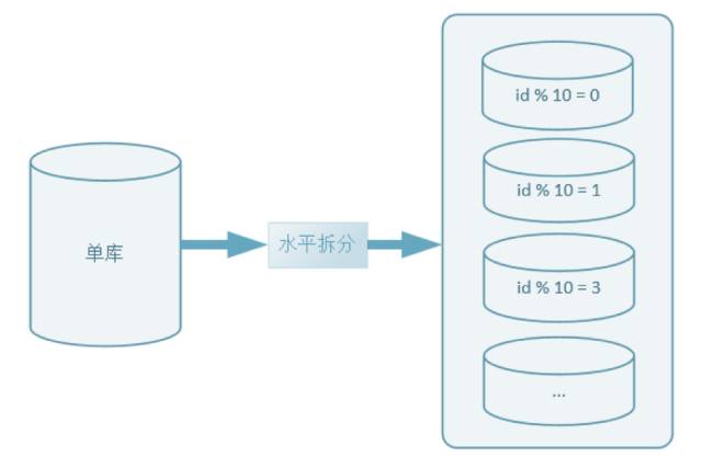水平拆分是把单表按某个规则把数据分散到多个表的拆分方式,比如:把单表1亿数据按某个规则拆分,分别存储到10个相同结果的表,每个表的数据是1千万,拆分出来的表,可以分别放至到不同数据库中,即同时进行水平拆库操作,如下图: