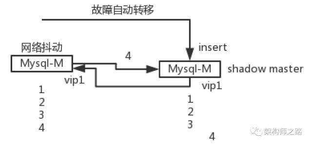 网络抖动前,主库1对上游提供写入服务,插入了一条记录,主键为4,并向shadow master主库2同步数据