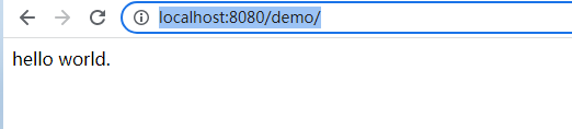 最后我们打开浏览器访问一下本地路径 http://localhost:8080/demo/ 即可看到页面上的输出内容hello world.