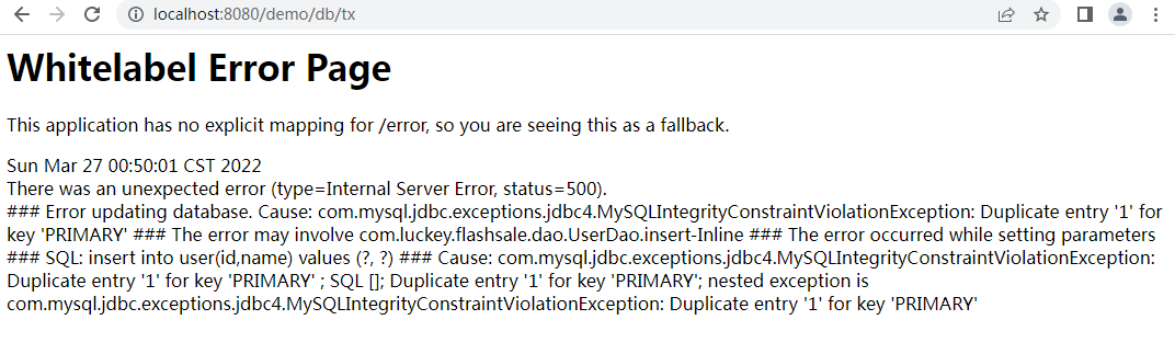 @Transactional public Boolean tx() { User u1 = new User(); u1.setId(2); u1.setName("2222"); userDao.insert(u1); User u2 = new User(); u2.setId(1); u2.setName("11111"); userDao.insert(u2); return true; }