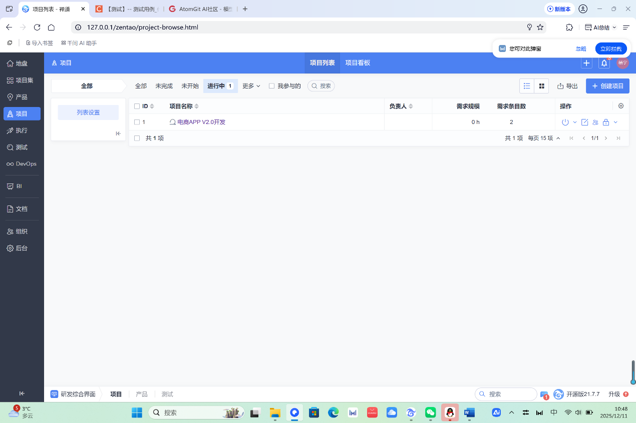 - 步骤1:创建项目并关联产品——点击“项目-创建项目”,项目名称填“电商APP V2.0开发”,开始时间选当天,结束时间选1个月后,在“关联产品”处勾选“电商APP V2.0”,点击“保存”。