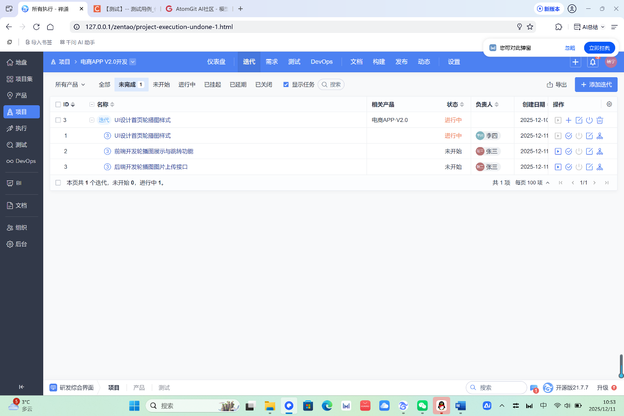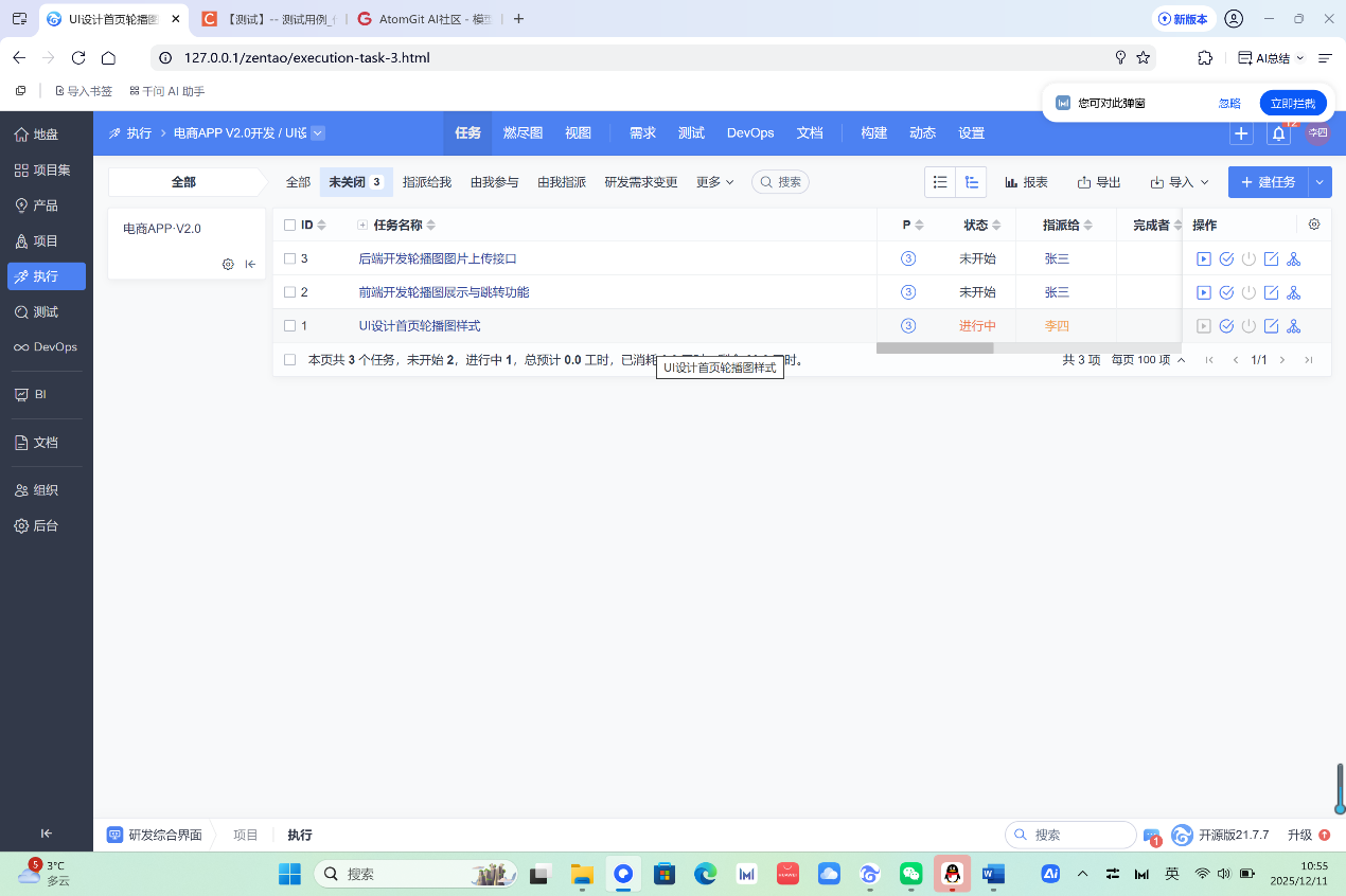 - 步骤3:拆解并分配任务——点击“电商APPV2.0开发-迭代-操作栏(+)建任务-创建任务”,关联需求“首页增加3张轮播图功能”,任务名称分3个:①“UI设计首页轮播图样式”(负责人选李四,截止时间3天内);②“前端开发轮播图展示与跳转功能”(负责人选张三,截止时间5天内);③“后端开发轮播图图片上传接口”(负责人选张三,截止时间4天内)。