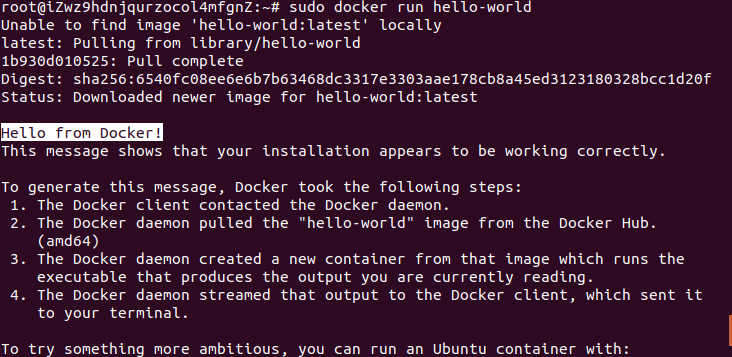 通过下载一个叫hello-world的镜像并运行起来,以此来检查Docker CE是否安装正确并能正常使用。