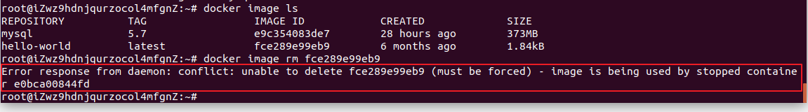 删除的时候,必须注意是否有容器在运行当前镜像文件,如果在使用,则需要先删除容器,才能删除镜像