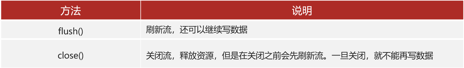 - close()方法是关闭流,关闭包含刷新,关闭后流不可以继续使用了。