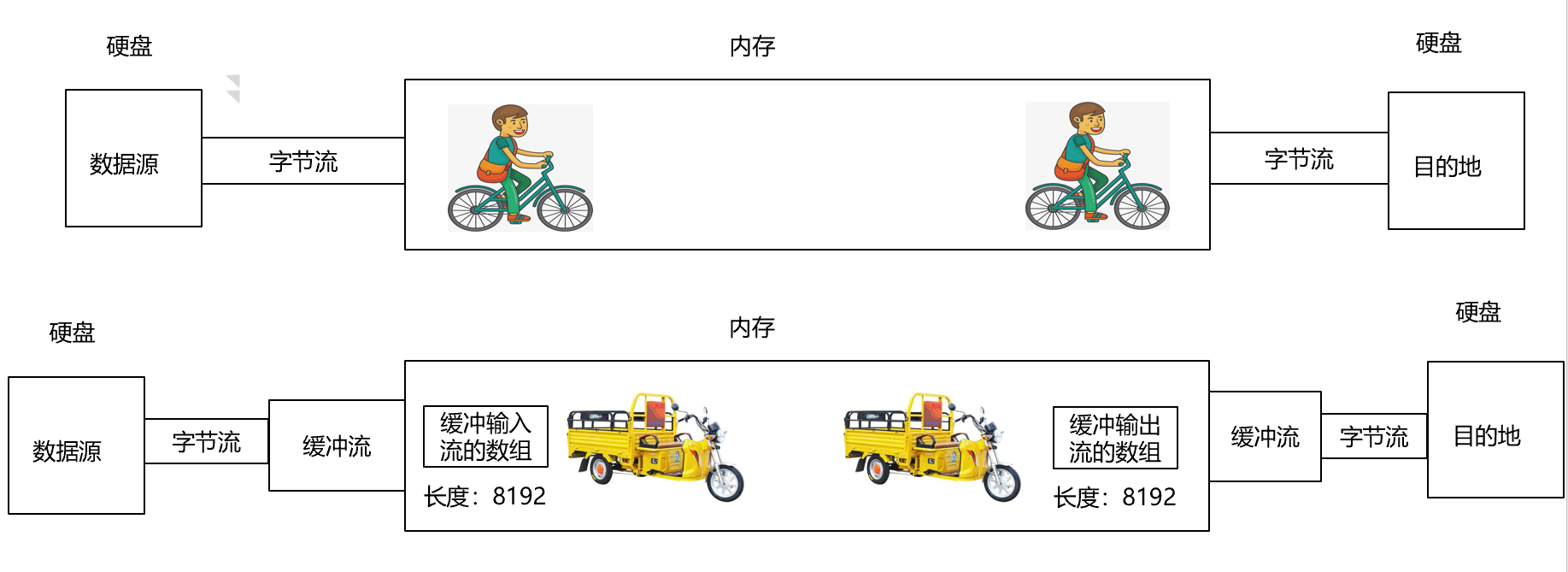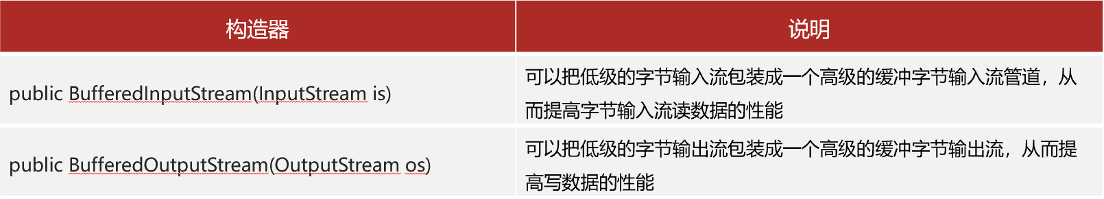 - 缓冲流也称为高效流、或者高级流。之前学习的字节流可以称为原始流。
