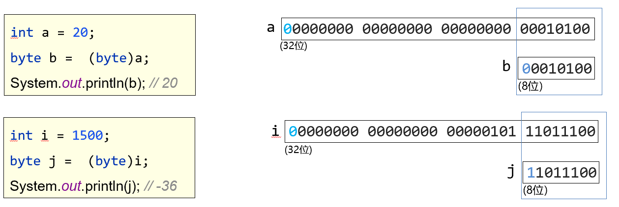 强制类型转换可能造成数据(丢失)溢出,如下图所示;