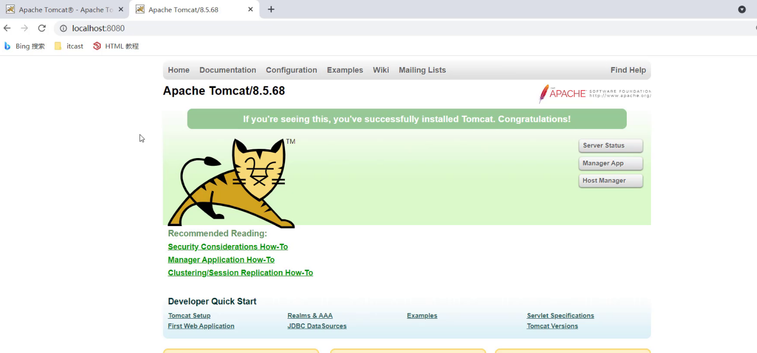 启动后,通过浏览器访问 http://localhost:8080能看到Apache Tomcat的内容就说明Tomcat已经启动成功。