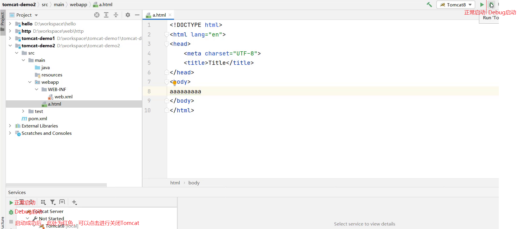 - 5.部署成功后,就可以启动项目,为了能更好的看到启动的效果,可以在webapp目录下添加a.html页面