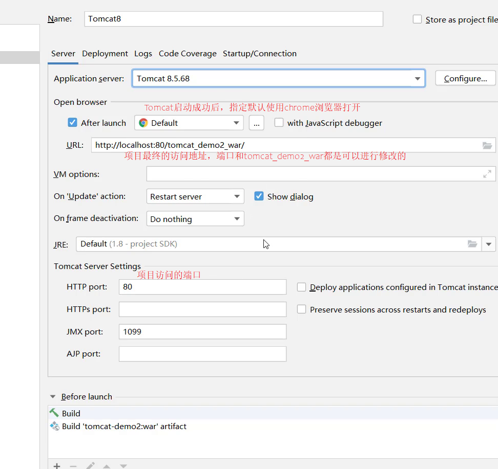 - 3.修改Tomcat的名称,此步骤可以不改,只是让名字看起来更有意义,HTTP port中的端口也可以进行修改,比如把8080改成80
