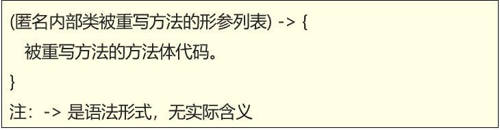 - 注意:必须是接口的匿名内部类,接口中只能有一个抽象方法