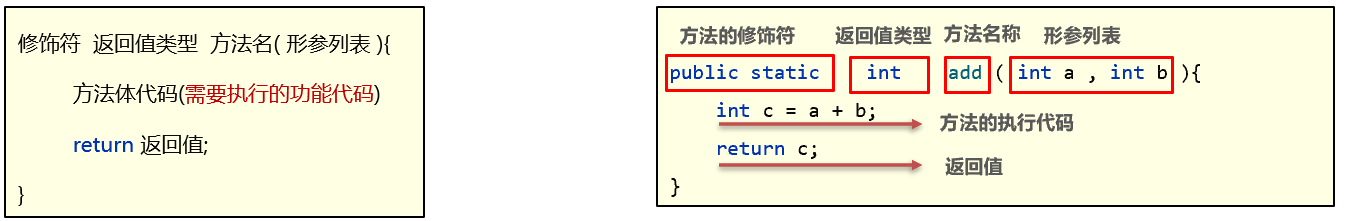- 如果方法不需要返回结果,返回值类型必须申明成void(无返回值), 此时方法内部不可以使用return返回数据。