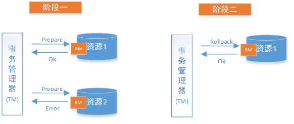 提交阶段:如果事务管理器收到了参与者的执行失败或者超时消息时,直接给每个参与者发送回滚(Rollback)消息;否则,发送提交(Commit)消息;参与者根据事务管理器的指令执行提交或者回滚操作,并释放事务处理过程中使用的锁资源。注意:必须在最后阶段释放锁资源。