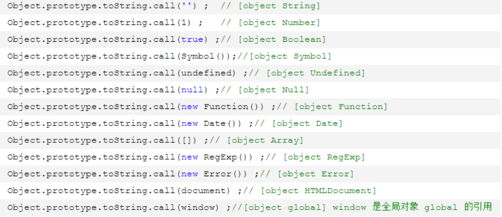 - 对于Object对象,直接调用toString()就能返回[object Object],而对于其他对象,则需要通过call、apply来调用才能返回正确的类型信息。