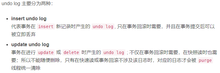 事务提交之后,undo log 并不能立马被删除,而是放入待清理的链表,由 purge 线程判断是否有其它事务在使用 undo 段中表的上一个事务之前的版本信息,从而决定是否可以清理 undo log 的日志空间。