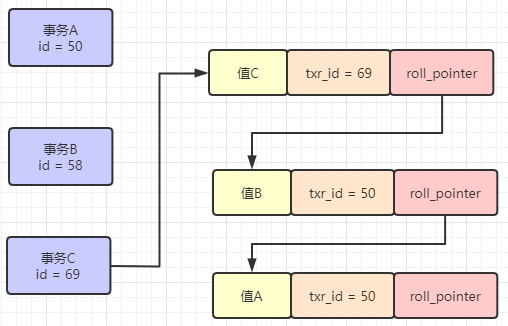 同时,undo log的回滚链条也是MVCC(多版本并发控制)实现的关键,如下图所示: