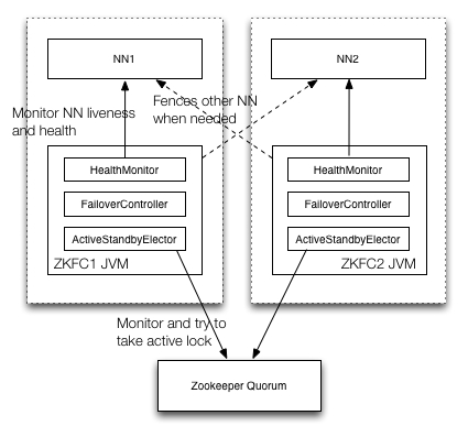 如上图所示,通常情况下Namenode和ZKFC同布署在同一台物理机器上, HealthMonitor, FailoverController, ActiveStandbyElector在同一个JVM进程中(即ZKFC), Namenode是一个单独的JVM进程。如上图所示,ZKFC在整个系统中有几个重要的作用: