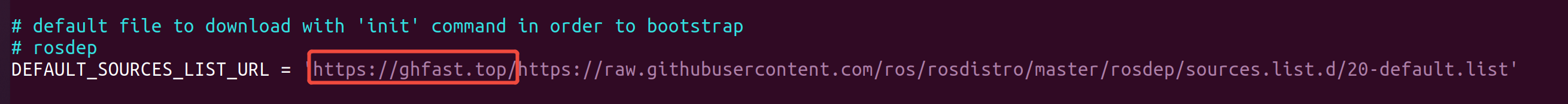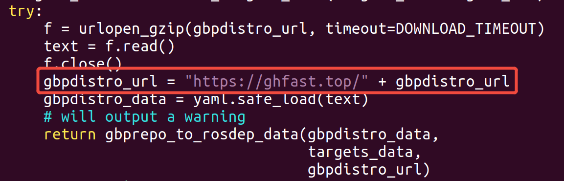 | sudo gedit /usr/lib/python2.7/dist-packages/rosdep2/gbpdistro_support.py | 206 | 加一行代码, gbpdistro_url= "https://ghfast.top/" + gbpdistro_url, 注意缩进 |