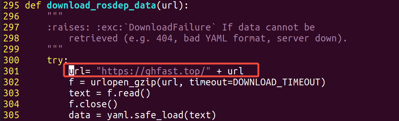| sudo gedit /usr/lib/python2.7/dist-packages/rosdep2/sources_list.py | 302 | 加一行代码, url= "https://ghfast.top/" + url, 注意缩进 |