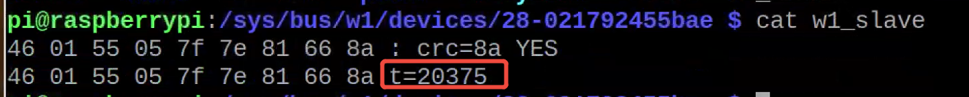 cd 到 /sys/bus/w1/devices/ 目录下,查看对应的传感器设备文件下的 w1_slave 文件