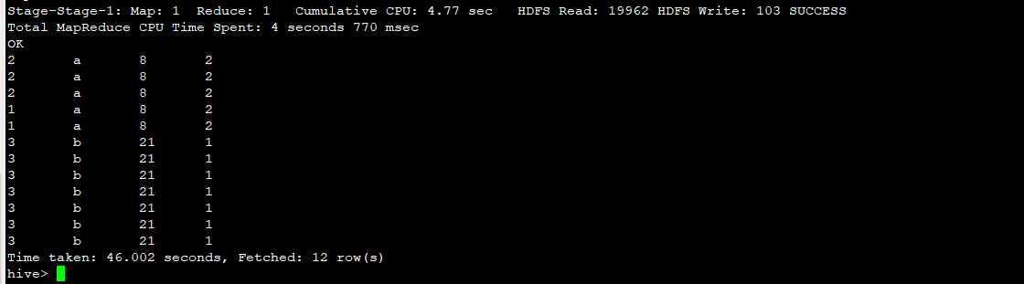 with da as ( select 1 a, 'a' b union all select 1 a, 'a' b union all select 2 a, 'a' b union all select 2 a, 'a' b union all select 2 a, 'a' b union all select 3 a, 'b' b union all select 3 a, 'b' b union all select 3 a, 'b' b union all select 3 a, 'b' b union all select 3 a, 'b' b union all select 3 a, 'b' b union all select 3 a, 'b' b ) select a ,b ,sum(a) over(partition by b) ,size(collect_set(a) over(partition by b)) from da