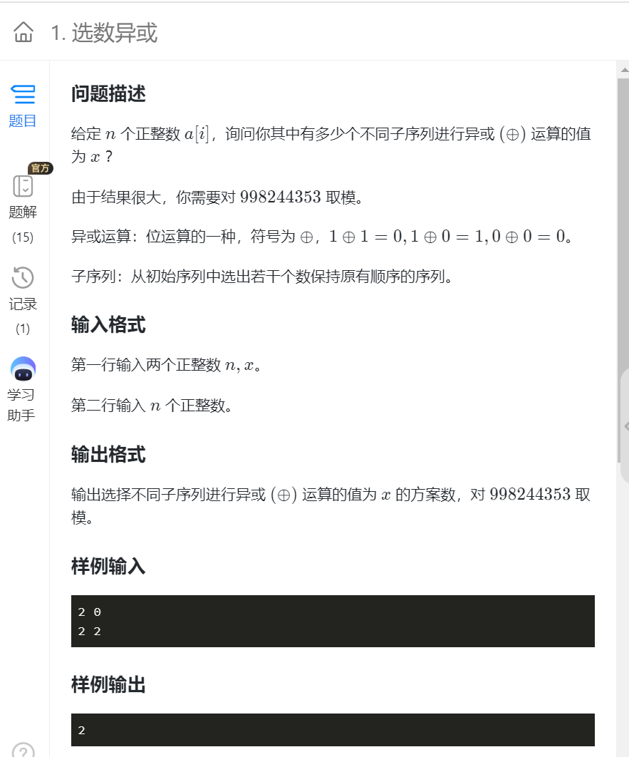 dp[i][j]=(dp[i-1][j]+dp[i-1][j^a[i]])%998244353;