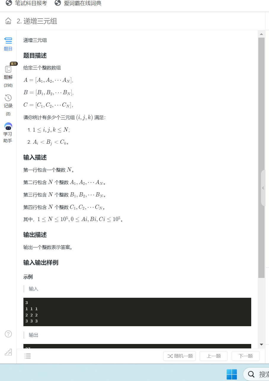 要将中间b数组作为参照,a数组中取比他小的有x个,c数组中取比他大有y个,那对于当前b中这个元素满足条件三元组有x*y个。