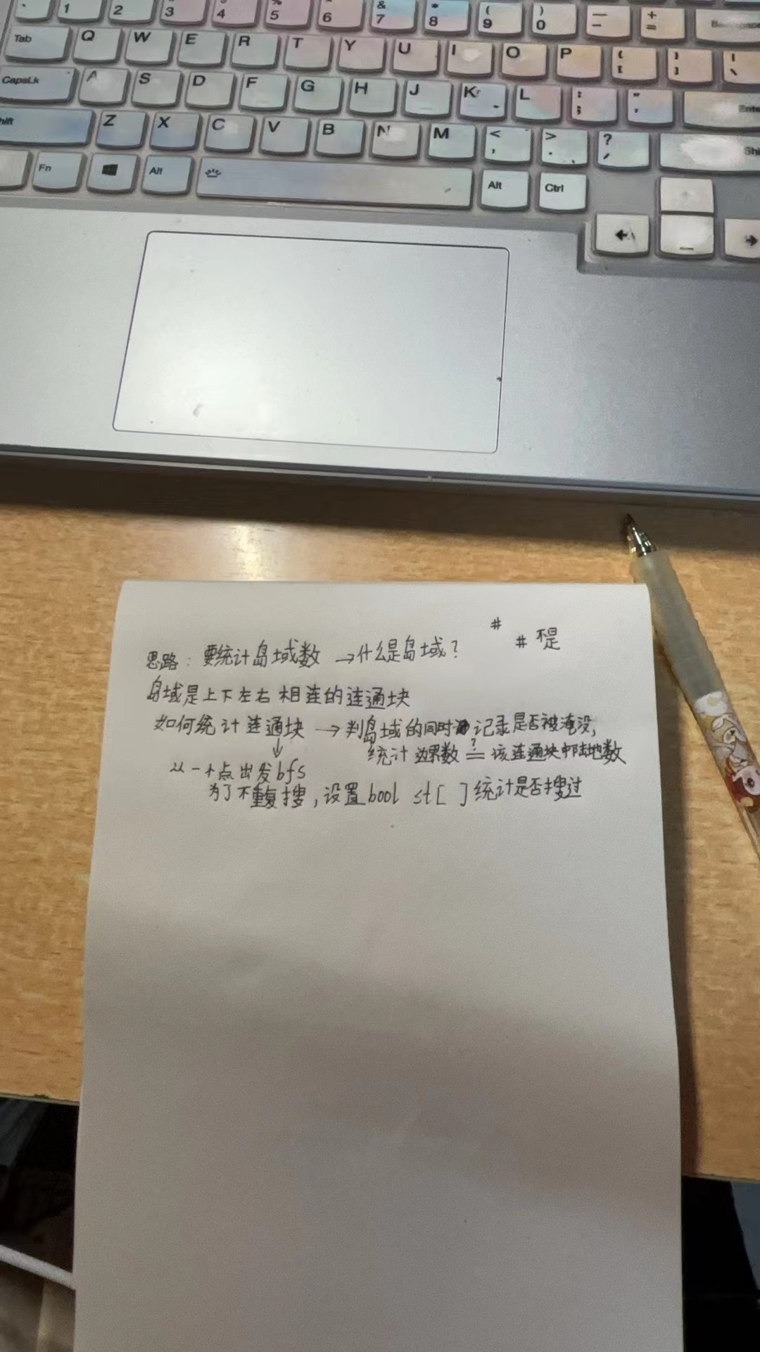 最后是他也是陆地那么加进这个连通块里(入队),并且因为判断该他是陆地也就是搜索过了所以st[ ][ ]设置为true