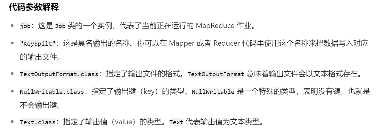 MultipleOutputs.addNamedOutput(job, "KeySpilt", TextOutputFormat.class, NullWritable.class, Text.class);