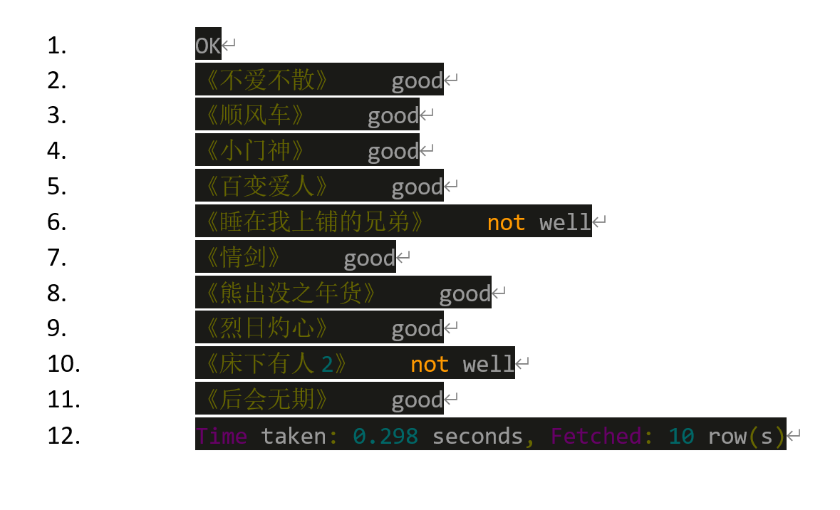 解析:就是会返回至多十条记录,且返回电影名,以及评级(按票房和50比较,大于50为good否则为not well)