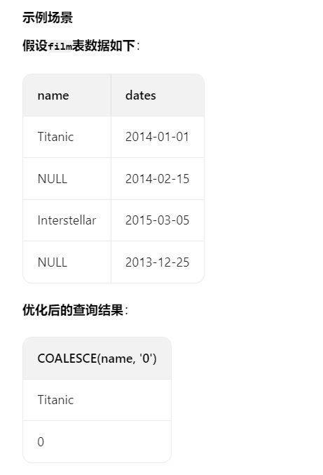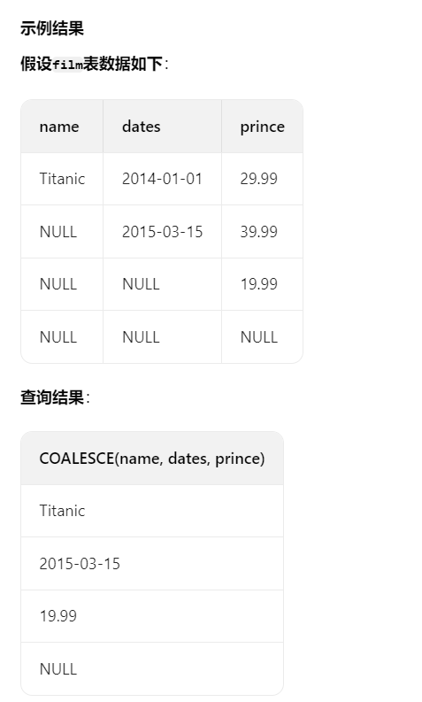 意思是按照name,dates,prince顺序来检查每一行,返回每一行按这个顺序第一个非空属性的值!