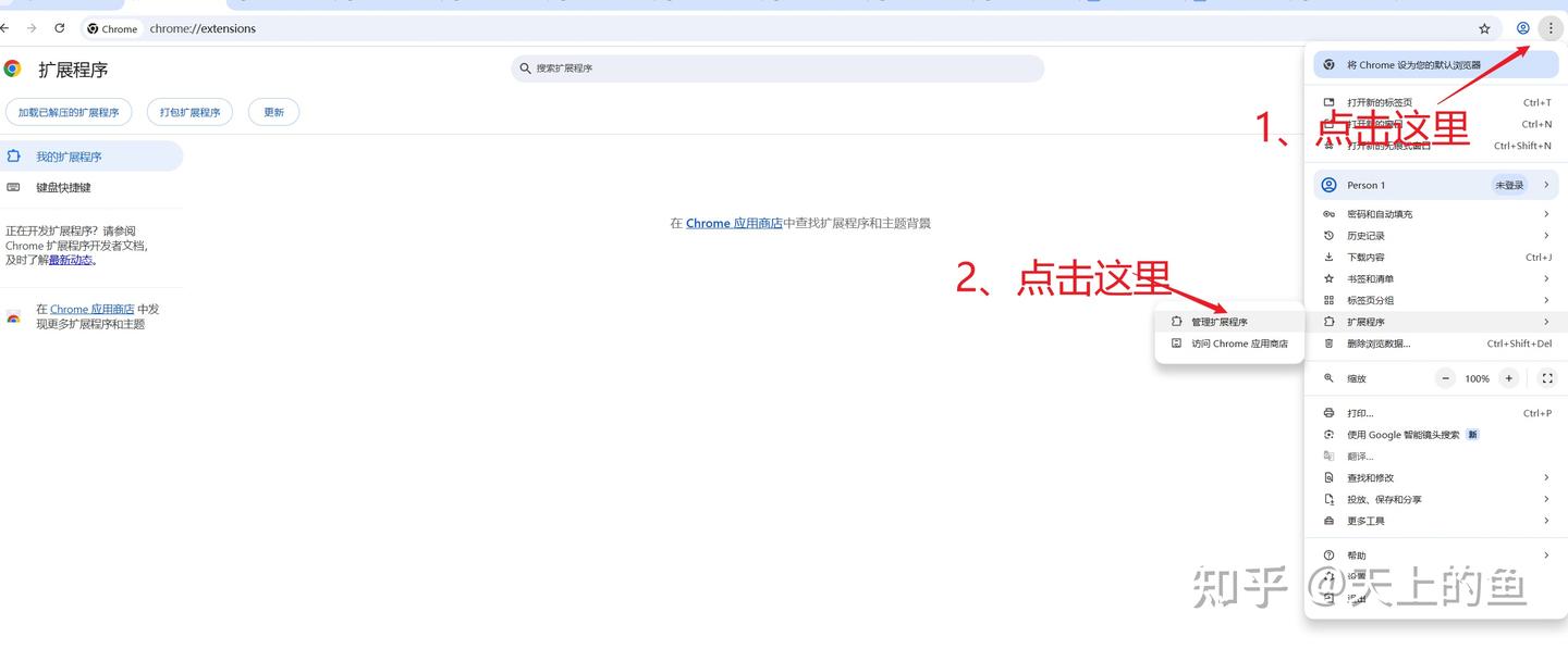 第一步:点击谷歌浏览器右上角,选择扩展程序-管理扩展程序,如图所示。