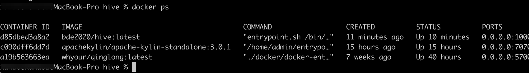 显示上图即 hive启动成功,并使用docker ps查看运行的镜像