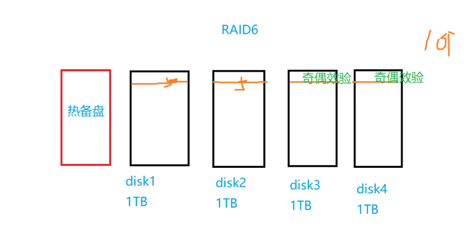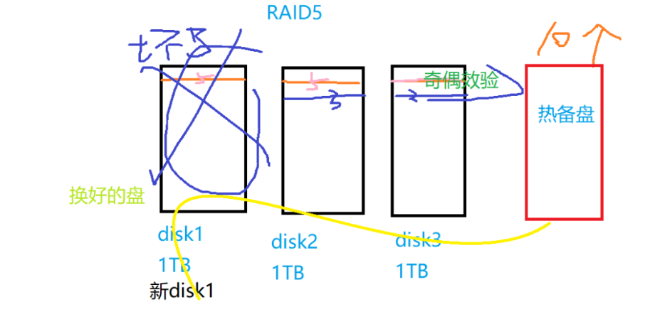 有热备盘的话,当一个磁盘坏了,奇偶效验会立即计算丢失的数据,然后放在热备盘里面,