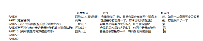 两块或者两块的倍数 ,容量增大了一倍 数据分布在两个磁盘里面,可靠性差,一个磁盘损坏了,就会丢失一般数据