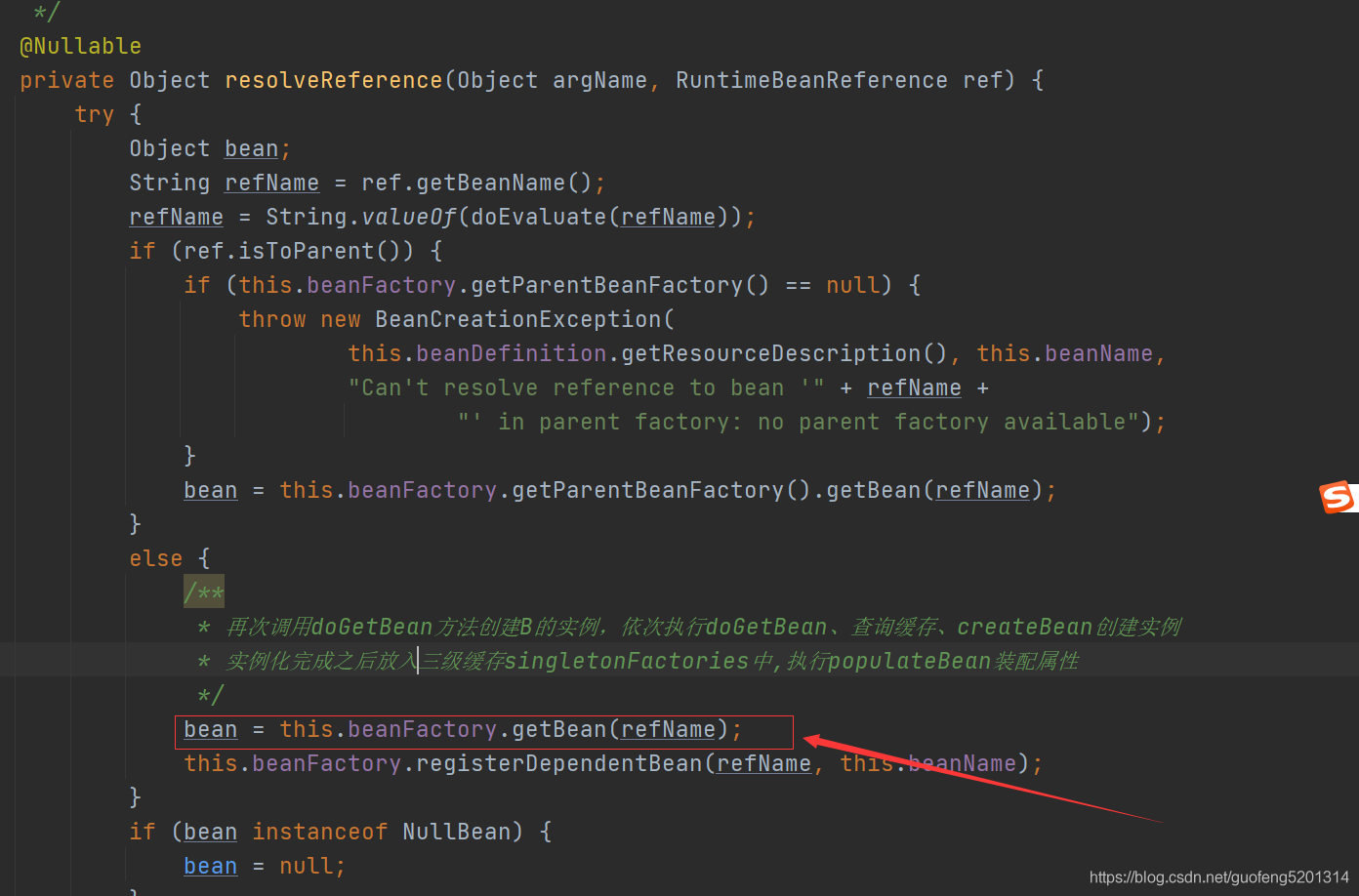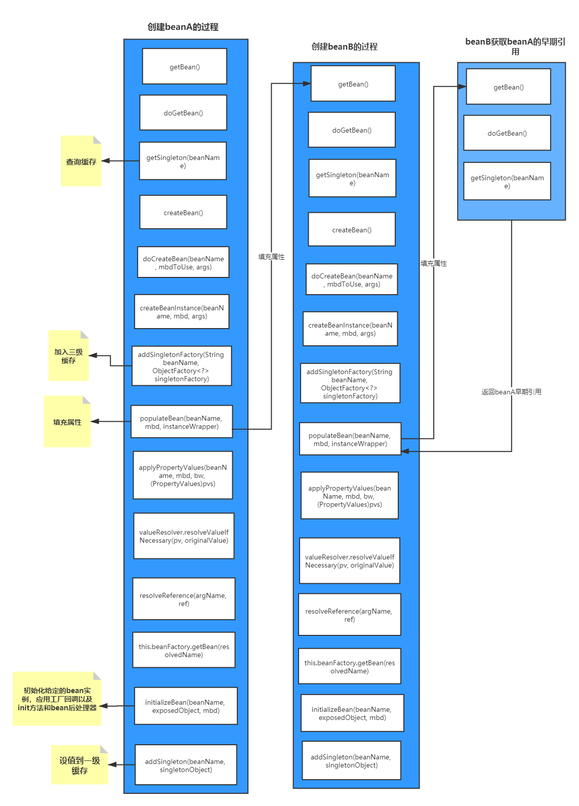 进入populateBean(beanName, mbd, instanceWrapper),依次再进入applyPropertyValues(beanName, mbd, bw, pvs),valueResolver.resolveValueIfNecessary(pv, originalValue),resolveReference(argName, ref)方法。执行到bean = this.beanFactory.getBean(refName)这行,执行getBean方法,再次调用doGetBean方法创建B的实例,依次执行doGetBean、查询缓存(getSingleton)、createBean创建实例,执行populateBean装配属性,发现有一个属性是A对象,因此再次调用doGetBean创建A的实例,但是执行到getSingleton查询缓存的时候,从三级缓存中查询到了A的实例(早期引用,未完成属性装配),把A放到二级缓存中,此时直接返回A,不用执行后续的流程创建A了,那么B就完成了属性装配,然后B执行init方法和bean后处理器完成初始化。