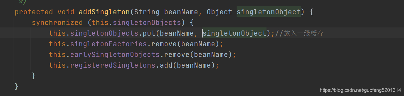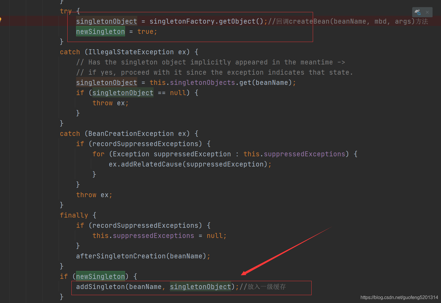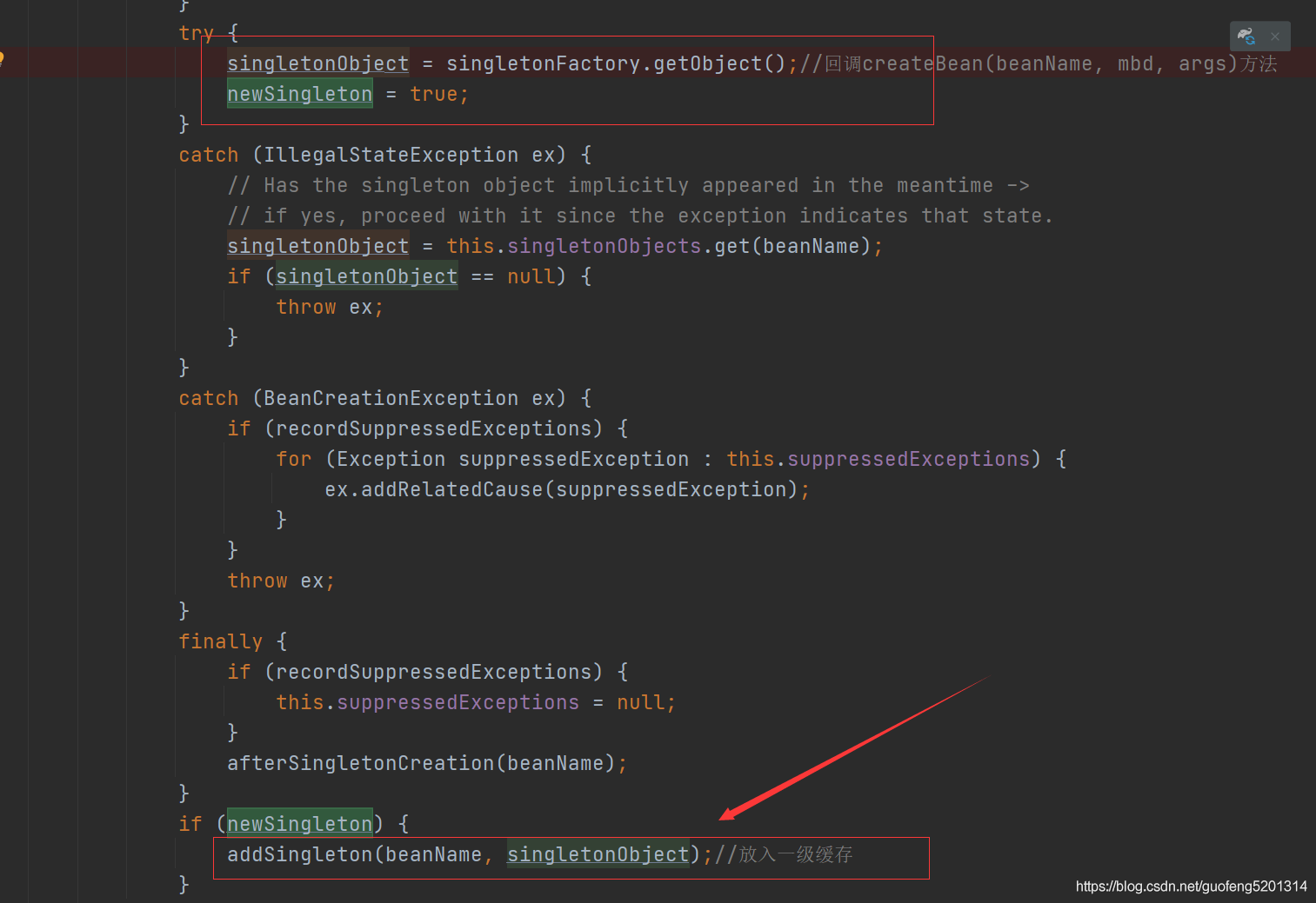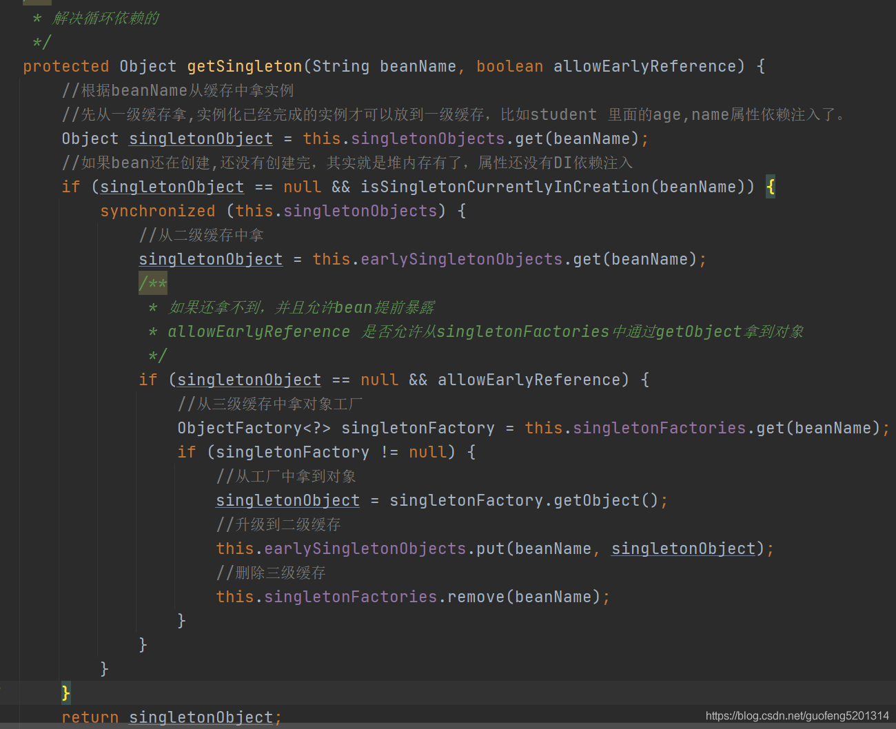 首先A先执行getBean(),getBean里面调用doGetBean方法,doGetBean再调用getSingleton(beanName)从缓存中获取实例,进入方法里面,先从一级缓存里面拿,一级缓存里面没有,再从二级缓存,二级缓存没有再从三级缓存里拿,刚开始BeanA进来,1,2,3级缓存都是没有的。getSingleton(beanName)返回null.