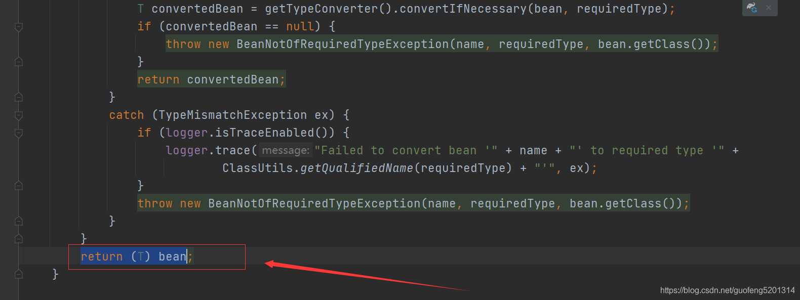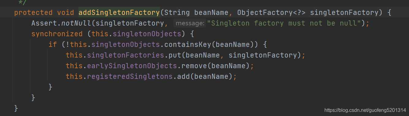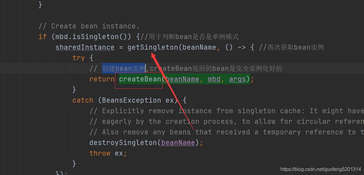 进入createBean中调用doCreateBean,进入里面调用createBeanInstance(beanName, mbd, args)创建bean对象,并将bean对象包裹在BeanWrapper对象中,调用addSingletonFactory(beanName, () -> getEarlyBeanReference(beanName, mbd, bean))把实例出来的beanA放入三级缓存中。