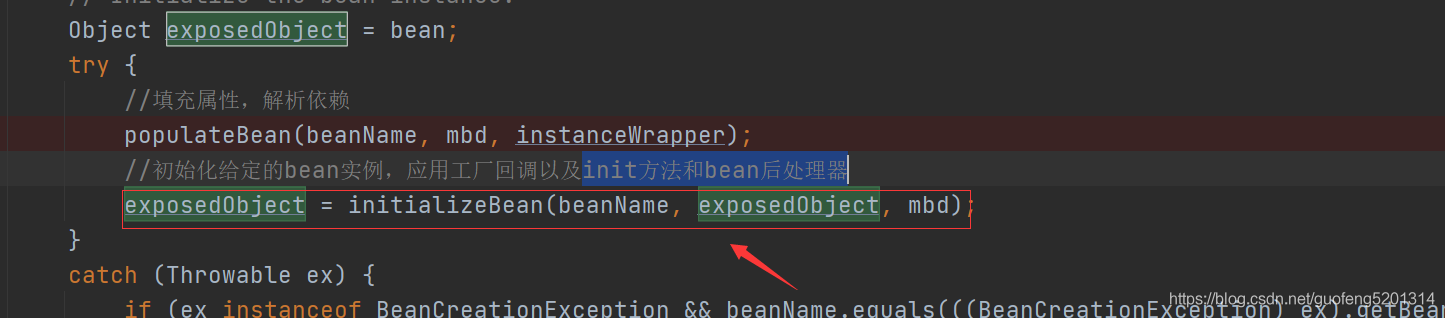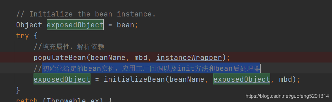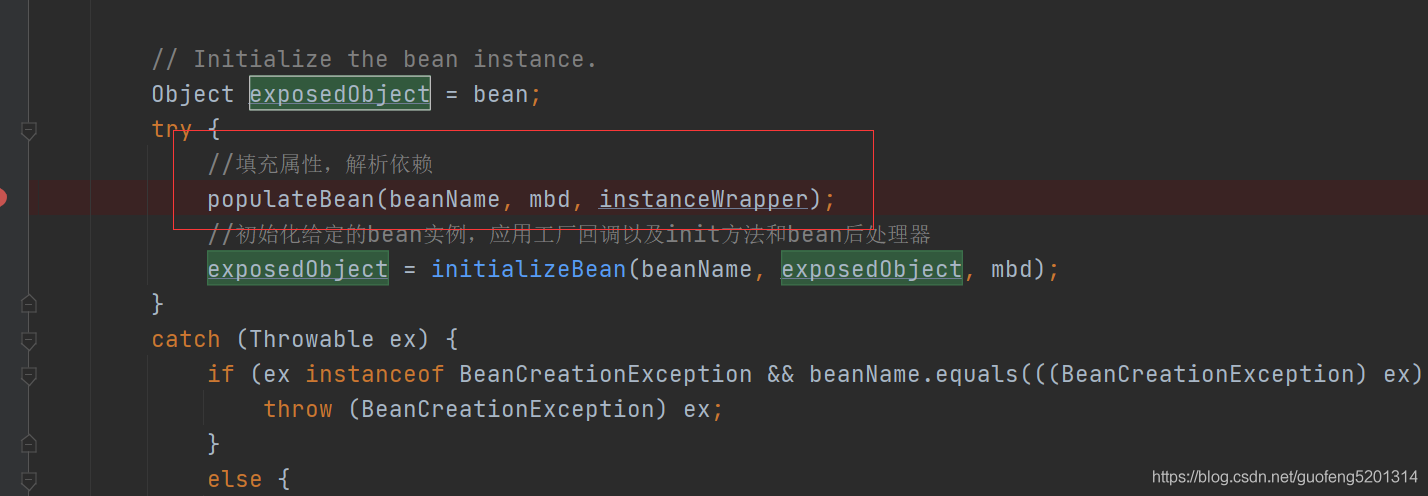 放入三级缓存后,然后填充属性,初始化给定的bean实例,应用工厂回调以及init方法和bean后处理器。但在调用populateBean(beanName, mbd, instanceWrapper)填充属性时,发现beanA有一个属性是B的对象。