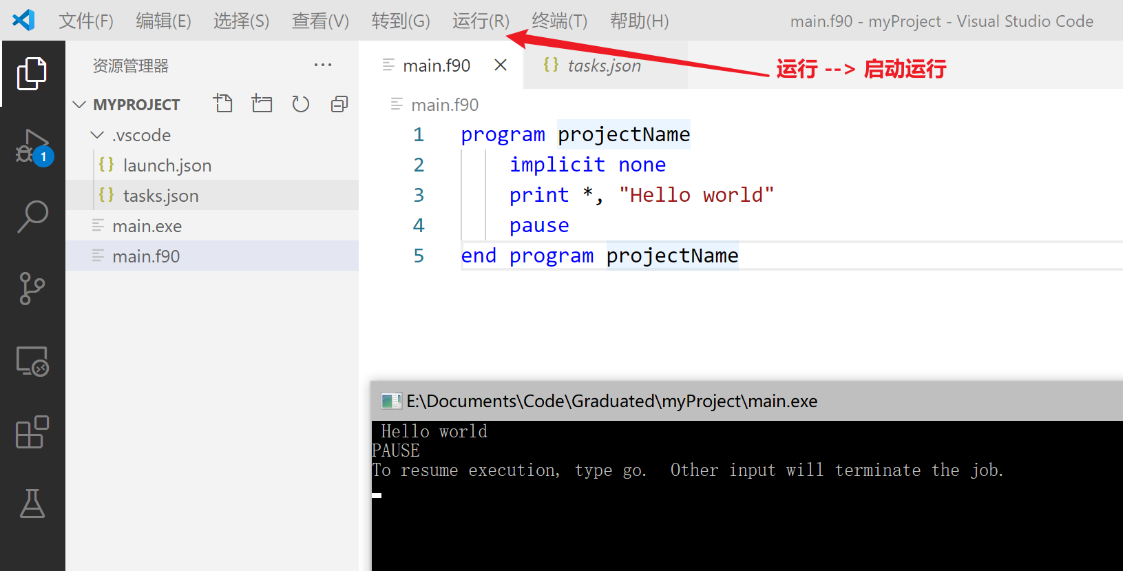 program projectName implicit none print *, "Hello world" !fortran语言注释 pause写上, 运行窗口不闪退 pause end program projectName -