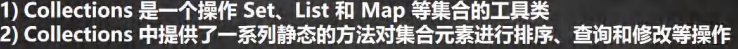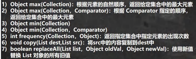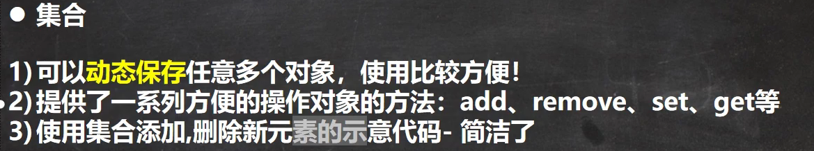 // 说明:以 ArrayList 实现类来演示 List list = new ArrayList(); // add:添加单个元素 list.add("jack"); list.add(10);//list.add(new Integer(10)) list.add(true); System.out.println("list=" + list); // remove:删除指定元素 //list.remove(0);//删除第一个元素 list.remove(true);//指定删除某个元素 System.out.println("list=" + list); // contains:查找元素是否存在 System.out.println(list.contains("jack"));//T // size:获取元素个数 System.out.println(list.size());//2 // isEmpty:判断是否为空 System.out.println(list.isEmpty());//F // clear:清空 list.clear(); System.out.println("list=" + list); // addAll:添加多个元素 ArrayList list2 = new ArrayList(); list2.add("红楼梦"); list2.add("三国演义"); list.addAll(list2); System.out.println("list=" + list); // containsAll:查找多个元素是否都存在 System.out.println(list.containsAll(list2));//T // removeAll:删除多个元素 list.add("聊斋"); list.removeAll(list2); System.out.println("list=" + list);//[聊斋]