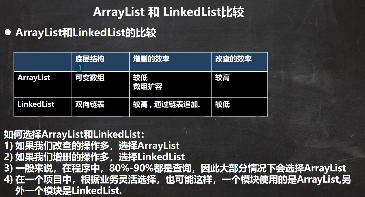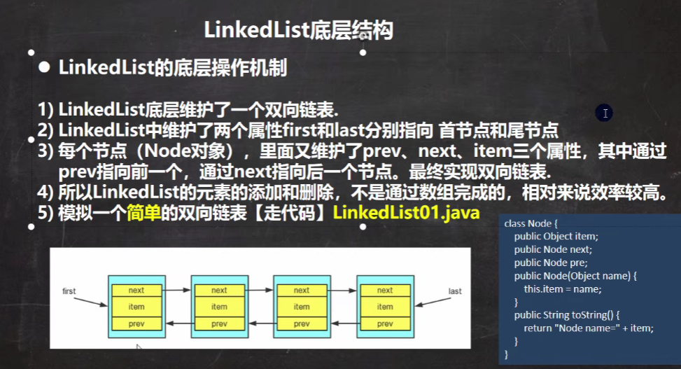 LinkedList linkedList = new LinkedList(); linkedList.add("first"); linkedList.add(1); linkedList.add(2); linkedList.add(3); linkedList.add("last"); System.out.println("linkedList=" + linkedList); //演示一个删除结点的 linkedList.remove(); // 这里默认删除的是第一个结点 //linkedList.remove(2); System.out.println("linkedList=" + linkedList); //修改某个结点对象 linkedList.set(1, 999); System.out.println("linkedList=" + linkedList); //得到某个结点对象 //get(1) 是得到双向链表的第二个对象 Object o = linkedList.get(1); System.out.println(o);//999 //因为 LinkedList 是 实现了 List 接口, 遍历方式 System.out.println("===LinkeList 遍历迭代器===="); Iterator iterator = linkedList.iterator(); while (iterator.hasNext()) { Object next = iterator.next(); System.out.println("next=" + next); } System.out.println("===LinkeList 遍历增强 for===="); for (Object o1 : linkedList) { System.out.println("o1=" + o1); } System.out.println("===LinkeList 遍历普通 for===="); for (int i = 0; i < linkedList.size(); i++) { System.out.println(linkedList.get(i)); }
