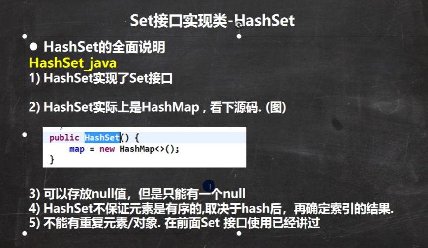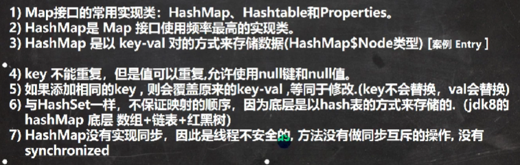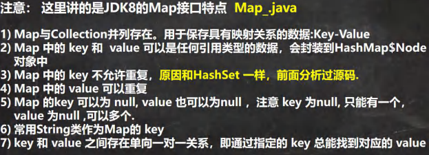//老韩解读 Map 接口实现类的特点, 使用实现类 HashMap //1. Map 与 Collection 并列存在。用于保存具有映射关系的数据:Key-Value(双列元素) //2. Map 中的 key 和 value 可以是任何引用类型的数据,会封装到 HashMap$Node 对象中 //3. Map 中的 key 不允许重复,原因和 HashSet 一样,前面分析过源码. //4. Map 中的 value 可以重复 //5. Map 的 key 可以为 null, value 也可以为 null ,注意 key 为 null, // 只能有一个,value 为 null ,可以多个 //6. 常用 String 类作为 Map 的 key //7. key 和 value 之间存在单向一对一关系,即通过指定的 key 总能找到对应的value Map map = new HashMap(); map.put("no1", "韩顺平");//k-v map.put("no2", "张无忌");//k-v map.put("no1", "张三丰");//当有相同的 k , 就等价于替换. map.put("no3", "张三丰");//k-v map.put(null, null); //k-v map.put(null, "abc"); //等价替换 map.put("no4", null); //k-v map.put("no5", null); //k-v map.put(1, "赵敏");//k-v map.put(new Object(), "金毛狮王");//k-v // 通过 get 方法,传入 key ,会返回对应的 value System.out.println(map.get("no2"));//张无忌 System.out.println("map=" + map);